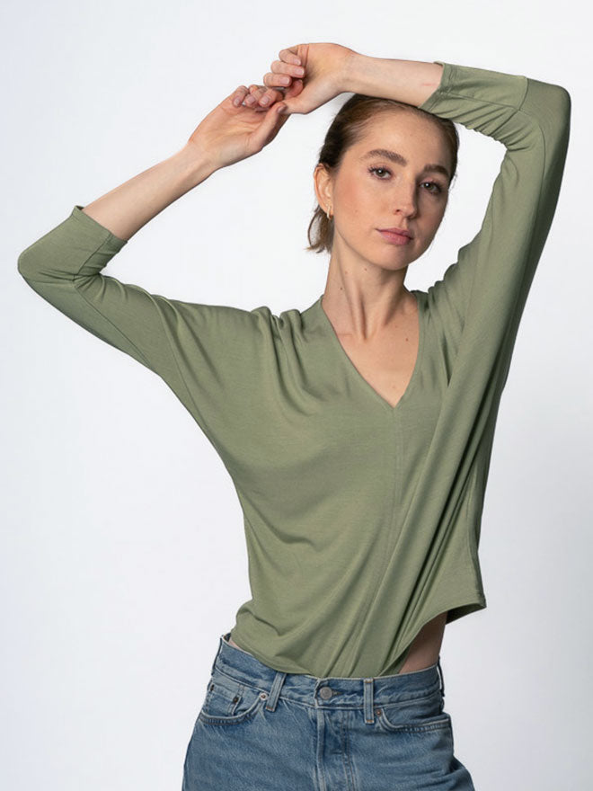 The Anouk V-neck shirt made of red lyocell is a beautiful, feminine basic piece to wear underneath and looks great on a video call in the home office or at dinner with friends. The skin-friendly and breathable lyocell material has a very flowing fall and offers maximum comfort: it regulates moisture and is barely noticeable on the skin. TENCEL™ brand lyocell from Lenzing in Austria is obtained from sustainably sourced wood in an environmentally friendly manufacturing process.